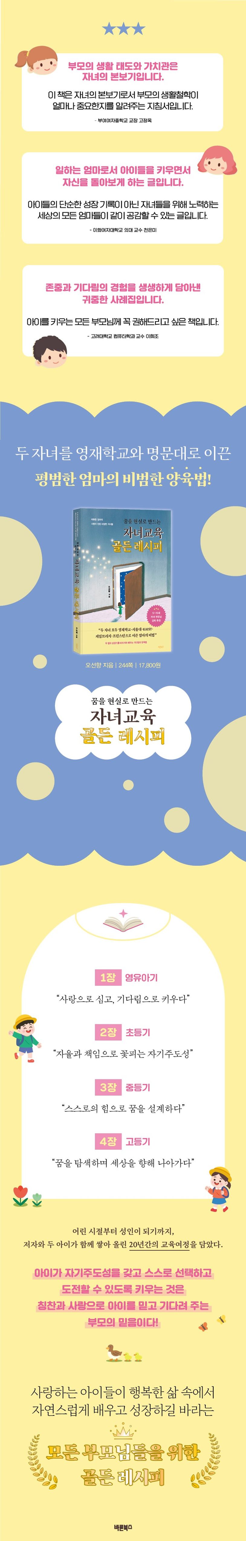 『꿈을 현실로 만드는 자녀교육 골든 레시피』는 사교육에 대한 불안, 아이의 성향에 대한 혼란, 유아기부터 대입까지 이어지는 긴 여정에서 갈 길을 잃은 부모들에게 따뜻하고 단단한 나침반이 되어줄 책이다. 자기주도성을 키우는 교육의 본질이 궁금한 모든 이들에게 꼭 권하고 싶은 한 권이다.