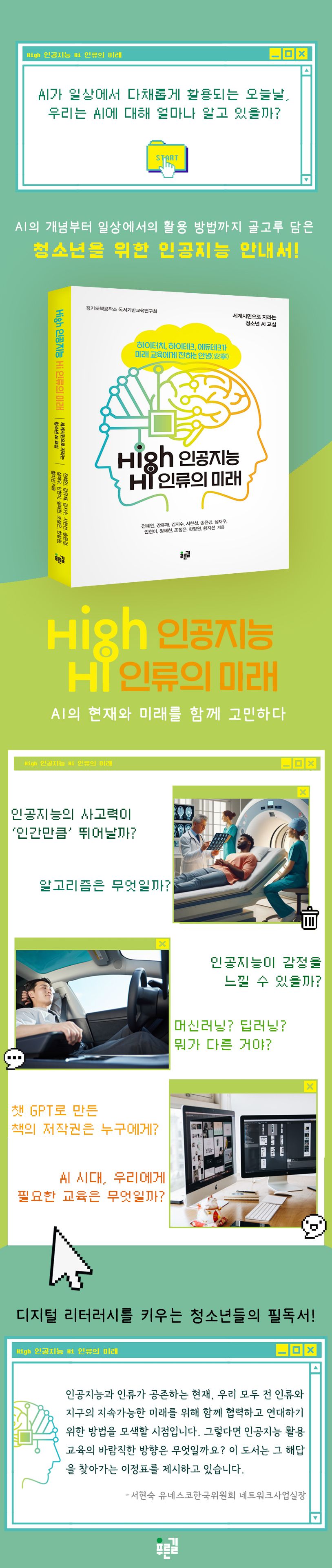 청소년의 눈높이에서 인공지능(AI)을 탐구하는 안내서 『High 인공지능 Hi 인류의 미래』가 푸른길에서 출간되었다. 세계시민으로 자라는 청소년 교실 시리즈의 세 번째 책이다. AI가 일상에서 다채롭게 활용되는 오늘날, 우리는 AI에 대해 얼마나 알고 있을까? AI가 우리의 삶에 어떤 영향을 미치고, 이를 어떻게 활용할 수 있는지에 대해 제대로 이해하고 있을까? 이러한 궁금증을 해결하기 위해, 세계시민 교육으로 활동하는 선생님들이 모여 청소년을 위한 특별한 안내서를 만들었다. 이 책은 인공지능의 기본 개념부터 일상생활에서의 활용 방법까지 체계적으로 다루어, 청소년들이 AI와 함께하는 미래를 준비할 수 있도록 도와준다.