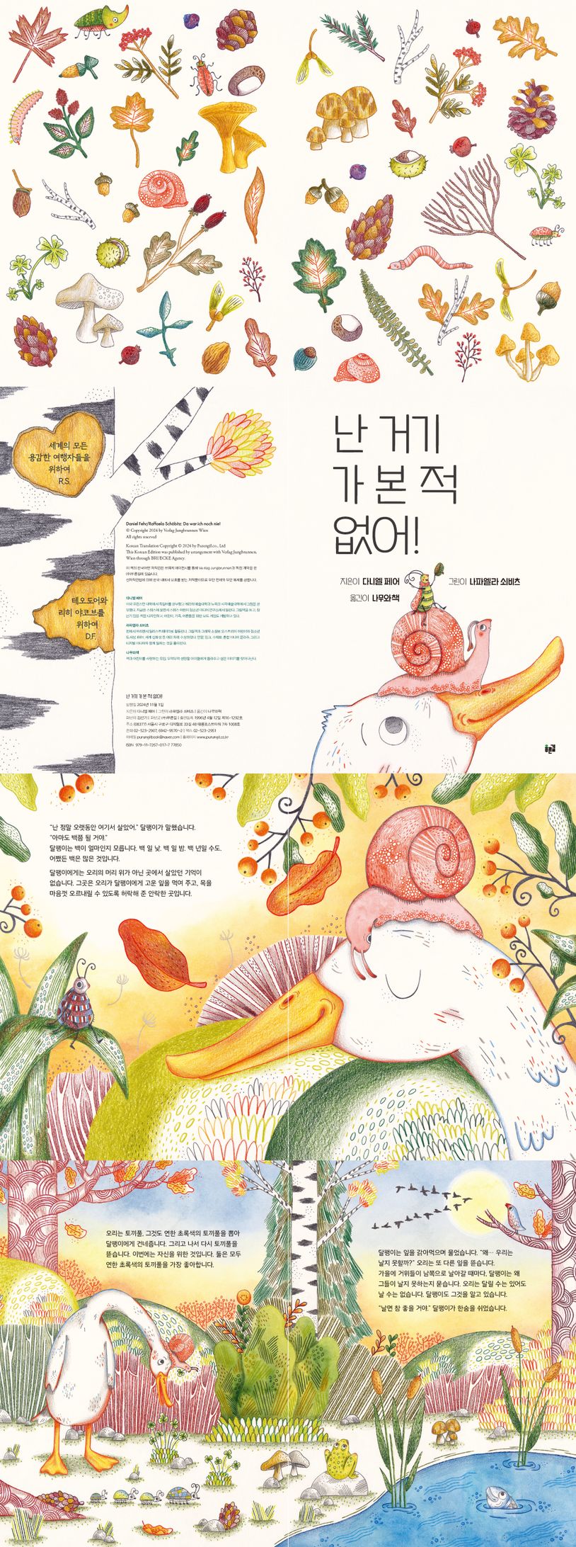 다채롭고 톡톡 튀는 색감으로 그려낸 오리와 달팽이의 우정 이야기 〈난 거기 가 본 적 없어〉가 푸른길에서 출간되었습니다. 어린이와 청소년을 위한 책을 쓰는 다니엘 페어는 이번엔 오리와 함께 지내는 달팽이의 더 넓은 세상을 보고 싶어 하는 마음과 그들이 살아가는 세상에 대한 상상을 이야기로 펼쳐내었습니다. 또한 그림작가 라파엘라 쇠비츠가 표현한 풍경과 동물, 곤충은 독특한 무늬와 선명한 색감으로 동화적이고 몽환적인 느낌을 줍니다. 그의 그림을 보고 있자면 주인공인 달팽이와 오리가 살아가는 세상이 더 궁금해지고, 이들이 가 본 적 없는 곳은 어떨지 상상력을 자극합니다. 이처럼 동화적인 상상력으로 바라본 자연의 풍경을 모두에게 익숙한 미술 도구인 색연필로 표현했습니다. 이들이 그려낸 독특한 우정과 모험의 이야기를 어린이와 어른 독자 모두에게 선물합니다.