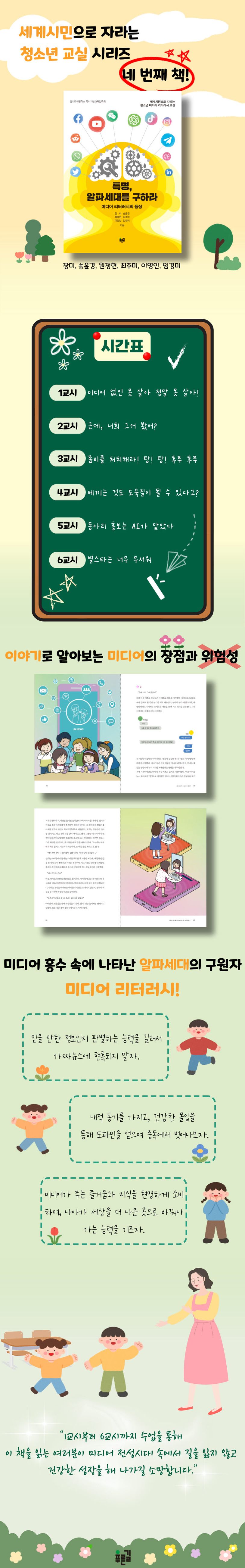또한, 생성형 AI와 같은 최신 기술을 어떻게 윤리적이고 현명하게 사용할 수 있을지, 사이버 폭력에 대한 경각심을 어떻게 기를 수 있을지, 저작권을 존중하는 방법은 무엇인지 등에 대해 깊이 있는 내용을 다룬다. 본문을 살펴보면 각 장의 교시마다 각각의 주제를 담은 이야기가 있다. 알파세대의 또래인 등장인물들의 이야기를 통해 미디어의 위험성을 알아보고 정보의 홍수 속에서 현명하게 자신을 지키는 방법을 배울 수 있다.