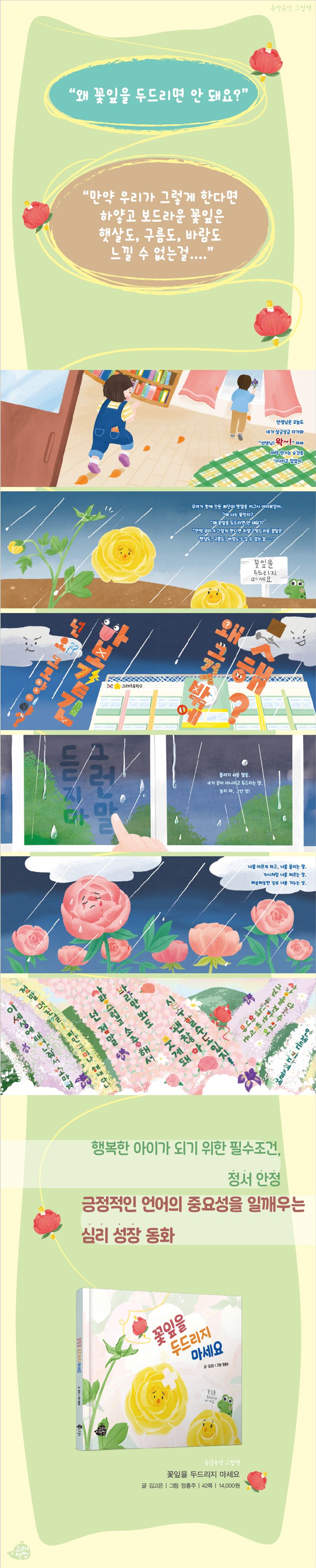 보드랍고 연약한 꽃잎을 상처의 말로 두드린다면 예쁜 꽃을 피울 수 없어요. 하지만 예쁜 꽃을 피우길 바라며 꽃잎을 응원하고 기다려준다면 예쁜 한 송이 꽃으로 피어날 수 있습니다.