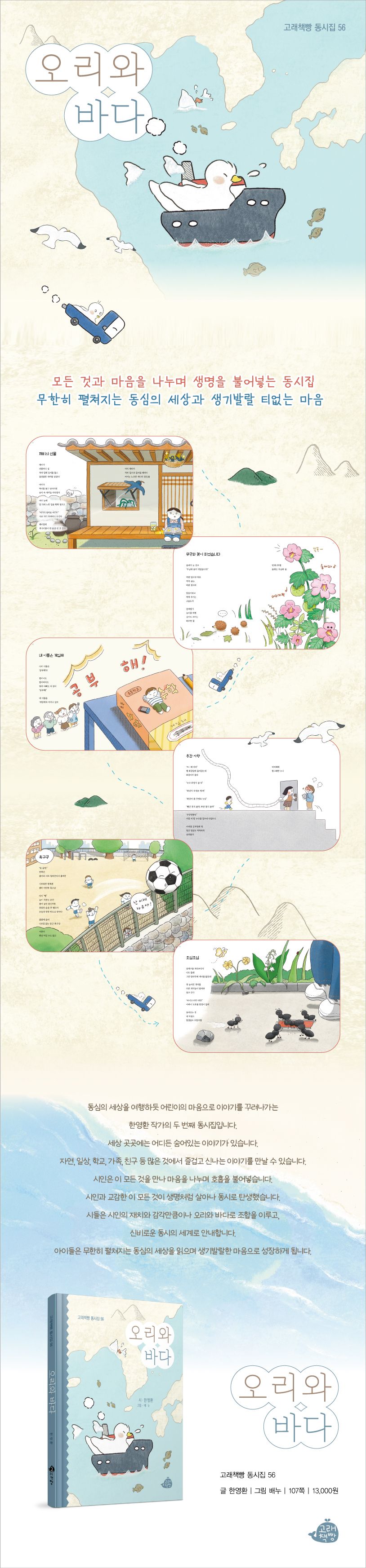시들은 시인의 재치와 감각만큼이나 오리와 바다로 조합을 이루고, 신비로운 동시의 세계로 안내합니다. 아이들은 무한히 펼쳐지는 동심의 세상을 읽으며 생기발랄한 마음으로 성장하게 됩니다.