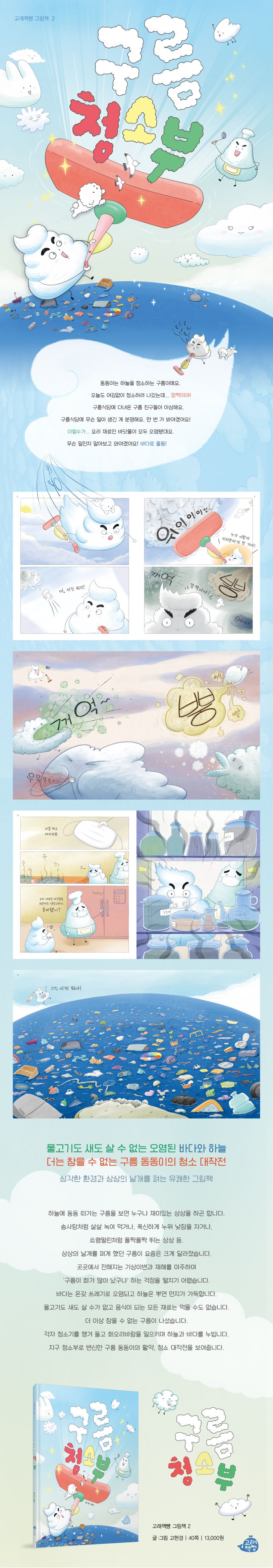 상상의 날개를 펴게 했던 구름이 요즘은 크게 달라졌습니다. 곳곳에서 전해지는 기상이변과 재해를 마주하며 ‘구름이 화가 많이 났구나’ 하는 걱정을 떨치기 어렵습니다. 바다는 온갖 쓰레기로 오염되고 하늘은 뿌연 먼지가 가득합니다. 물고기도 새도 살 수가 없고 음식이 되는 모든 재료는 먹을 수도 없습니다. 더 이상 참을 수 없는 구름이 나섰습니다. 각자 청소기를 챙겨 들고 회오리바람을 일으키며 하늘과 바다를 누빕니다.
