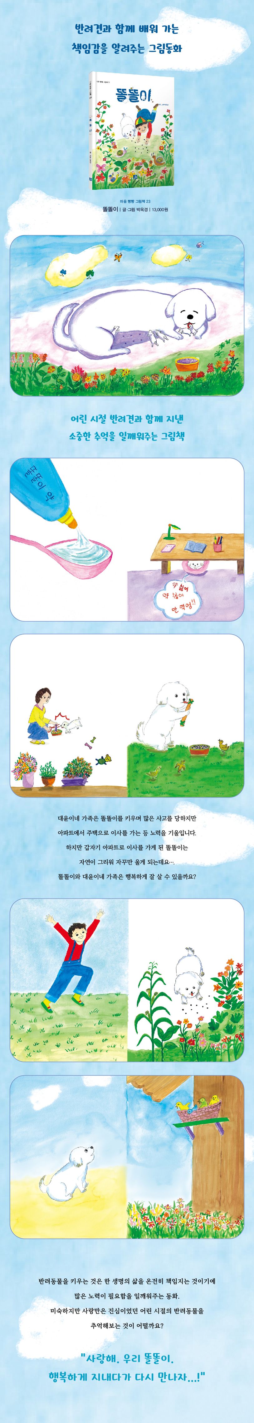 강아지를 무척 키우고 싶은 대윤이는 부모님을 졸라 자신이 돌보는 조건으로 집으로 데려옵니다. 똘똘이로 이름 지은 강아지에게 대윤이는 사랑을 쏟습니다, 하지만 약속과 달리 정작 똘똘이를 돌보는 것은 엄마의 몫이었습니다. 똘똘이는 가족들의 부주의로 깁스를 하기도 하고 혀가 베이는 등 사고를 당하기도 합니다.