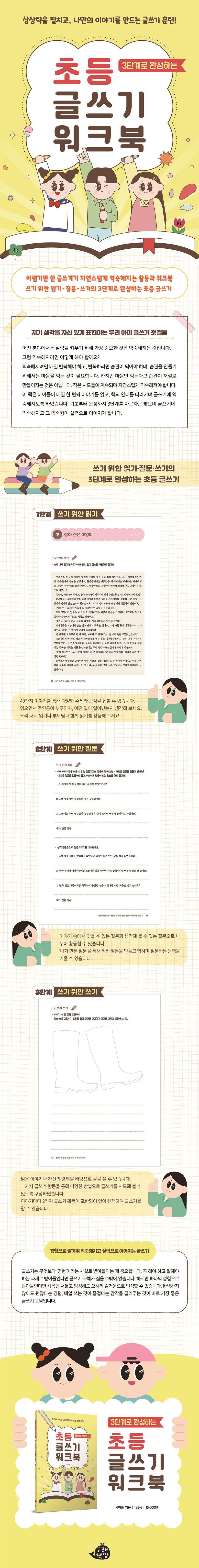 글쓰기를 어렵게만 생각하는 아이들 책이 제시하는 대로 읽고 생각하고 쓰며 자연스럽게 글쓰기에 익숙해지도록 돕는 활동서이다. 아이들은 전래 동화와 명작 읽기, 질문을 통한 생각 확장, 다양한 쓰기 등의 워크북을 통해 글쓰기가 어렵지도 않고 즐거운 활동임을 배우게 된다.