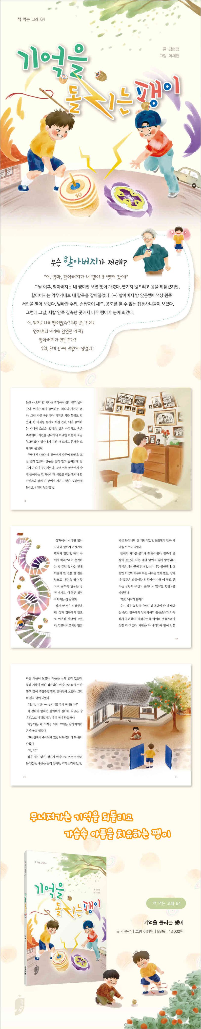 민욱이는 오늘도 치매에 걸린 할아버지에게 팽이를 뺏겼습니다. 엄마에게 말해봤자 할아버지를 이해해야 한다고만 할 게 분명합니다. 엄마가 할아버지를 모시고 병원에 갔을 때, 조금 열려있는 할아버지 방에 들어가 앉은뱅이책상의 오른쪽 서랍을 열어 보니 민욱이의 팽이들과 나무 팽이 하나가 보입니다.