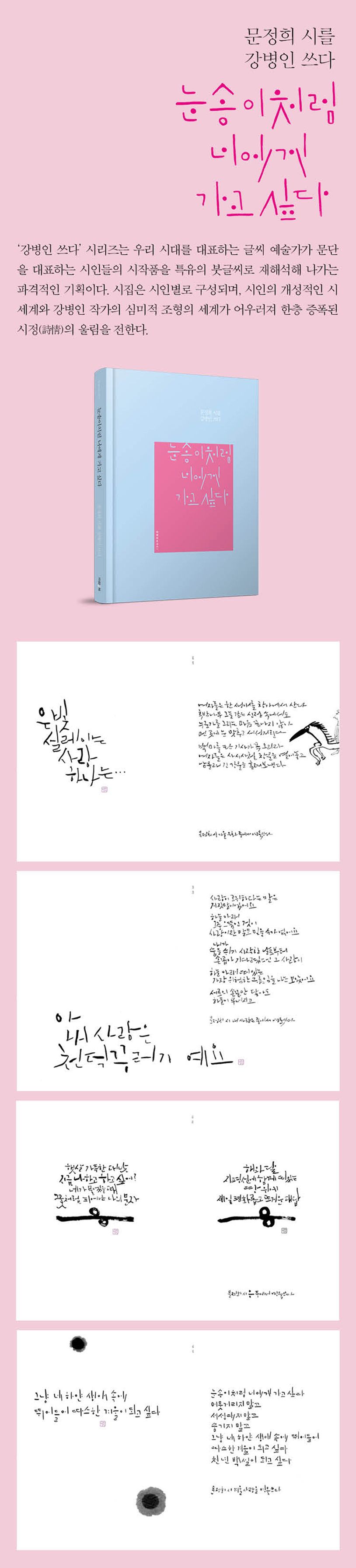 한국 문학사에 기록될 빛나는 문장과 대표 시인들의 시 작품을 글씨 예술가 강병인이 자신만의 필법(筆法)으로 풀어내는 ‘강병인 쓰다’ 시리즈의 첫 번째 책의 개정판. 문정희 시인이 ‘사랑’을 테마로 삼아 가려 뽑은 시 39편을 강병인이 심혈을 기울여 쓴 손글씨 시집이다. ‘강병인 쓰다’ 시리즈는 우리 시대를 대표하는 글씨 예술가가 문단을 대표하는 시인들의 시작품을 특유의 붓글씨로 재해석해 나가는 파격적인 기획이다. 시집은 시인별로 구성되며, 시인의 개성적인 시 세계와 강병인 작가의 심미적 조형의 세계가 어우러져 한층 증폭된 시정(詩情)의 울림을 제공한다. 독자들은 이 시리즈를 통해 규격화된 활자에 대한 밋밋한 접근에서 벗어나, 시인의 시심(詩心)에 다가가는 기쁨과 더불어 시 읽기의 또 다른 차원의 즐거움을 경험할 것이다.