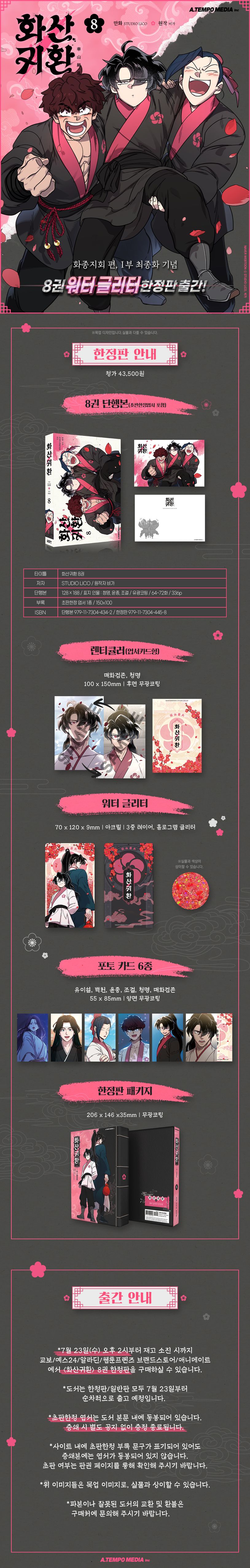 대망의 화종지회 편의 최종화가 수록되어 있는 「화산귀환」 8권. 삼대 제자들의 비무에서 십연승을 거둔 청명은 종남 이대 제자들에게 연승전을 제안한다. 화려한 청명의 검은 화산의 검이 무엇인지 그들에게 제대로 각인시키게 된다. 이번 8권 한정판에선 청명과 매화검존이 담겨있는 엽서카드형 렌티큘러와 포토카드 6종, 그리고 각도에 따라 반짝이는 워터 글리터를 만나볼 수 있다.