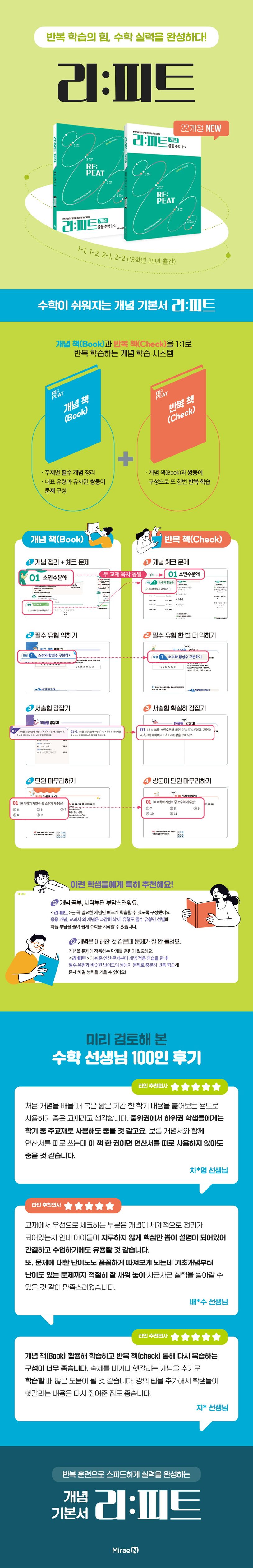 〈리피트 개념 중등 수학〉의 3단계 학습법을 통해 지속가능한 수학 실력을 쌓을 수 있습니다.