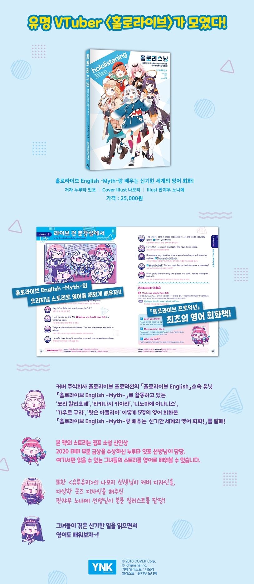 커버 주식회사 홀로라이브 프로덕션의 「홀로라이브 English」소속 유닛「홀로라이브 English -Myth-」로 활동하고 있는 '모리 칼리오페', '타카나시 키아라', '니노마에 이나니스', '가우르 구라', '왓슨 아멜리아' 이렇게 5명의 영어 회화본 「홀로라이브 English -Myth-랑 배우는 신기한 세계의 영어 회화!」를 발매!