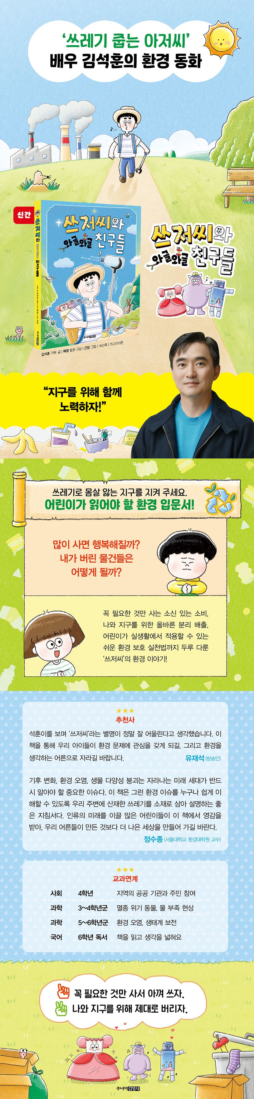 망태기 둘러메고, 집게 들고 길거리의 숨은 보물을 찾아다니는 ‘쓰레기 줍는 아저씨’ 김석훈이 어린이책 저자로 대중 앞에 선다. 《쓰저씨와 와글와글 친구들》은 유튜브 채널 ‘나의 쓰레기 아저씨’에서 직접 몸으로 뛰며 생활폐기물을 수거하고, 폐기물 저장조와 소각로, 매립지와 재활용품 선별처리장 등 쓰레기 처리의 실태와 심각성을 낱낱이 보여주며 대중에게 환경 보호·실천의 메시지를 전해 온 활동가 김석훈이 미래 세대의 주역인 어린이를 위해 집필한 책이다.