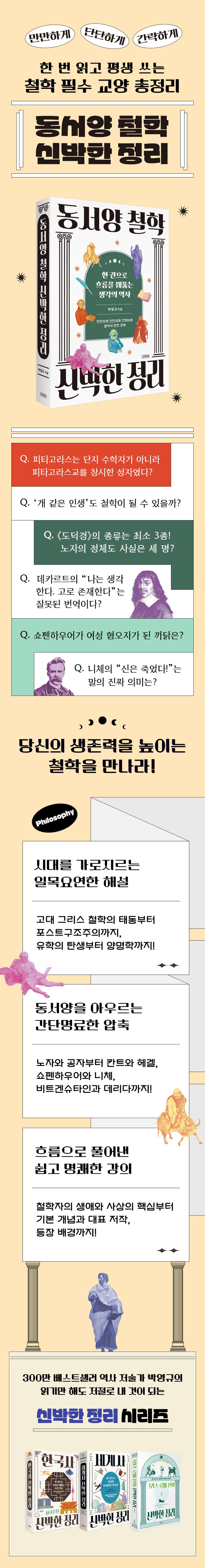 300만 밀리언셀러 저자 박영규가 당신의 생존력을 높이는 최소한의 철학 지식 《동서양 철학 신박한 정리》를 펴냈다. 고대 그리스 철학의 태동부터 포스트구조주의까지, 유학의 탄생부터 양명학까지, 탈레스와 소크라테스, 노자와 공자부터 칸트와 헤겔, 쇼펜하우어와 니체, 비트겐슈타인과 데리다까지! 시대와 인물을 아우르는 종합적인 관점으로 동서양의 주요 사상을 정립한 철학자의 생애는 물론 꼭 알아야 할 사상의 기본 개념과 대표 저작, 등장 배경을 간단명료하고 일목요연하게 압축했다. 쇼펜하우어만 읽어본 독자도, 니체만 아는 독자도, 윤리와 철학 공부가 처음인 청소년과 배웠지만 다시 시작하고 싶은 성인 모두 수천 년 철학사를 단숨에 통달할 수 있다.