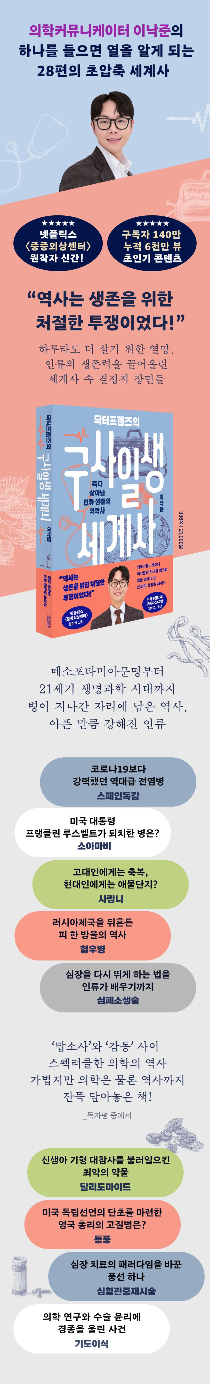 140만 구독자 유튜브 채널 ‘닥터프렌즈’ 이낙준 작가의 〈의학의 역사〉가 누적 조회 수 6천만 돌파, 대중의 폭발적인 사랑을 받으며 《닥터프렌즈의 오마이갓 세계사》에 이어 《닥터프렌즈의 구사일생 세계사》로 출간됐다. 지루한 역사도 이낙준이 이야기하면 다르다. 넷플릭스 화제작 〈중증외상센터〉의 원작자이기도 한 그는, 유쾌하고 생동감 있는 설명으로 ‘의학의 역사’라는 어려운 주제를 쉽고 재미있게 풀어낸다. 의사로서의 전문성과 유튜버로서의 흡인력, 웹소설 작가로서의 필력으로 탄생한 이 책은 기존의 역사서나 의학서에서는 좀처럼 보기 힘든 깊이와 재미를 모두 갖춘 교양서다.