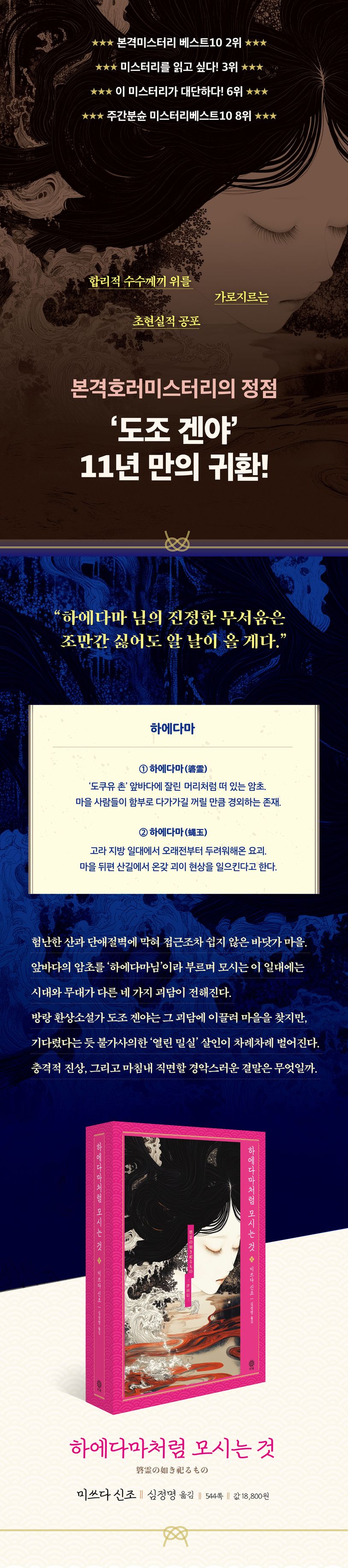 《미즈치처럼 가라앉는 것》 이후 실로 오랜만에, ‘도조 겐야’ 시리즈가 신작으로 한국 독자를 찾는다. 오랜 기다림을 보상하듯, 사건의 트릭은 더 치밀해졌고, 호러의 강도는 더욱 매서워졌으며, 도조 겐야의 활약은 더더욱 거침없어졌다.