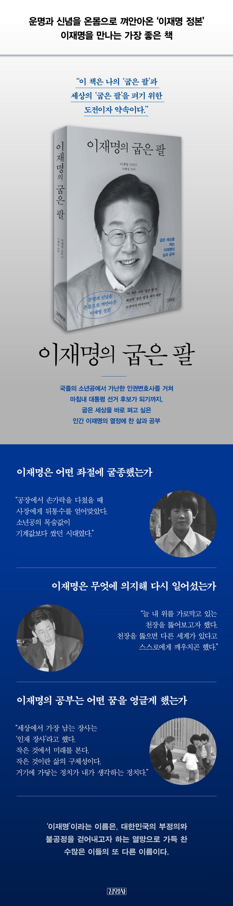 이재명은 누구이며, 어떻게 살아왔는가. 무엇을 꿈꾸었는가. 어떤 좌절에 굴종했고 다시 어느 것에 의지해 일어섰는가. 《이재명의 굽은 팔》은 국졸의 소년공에서 가난한 인권변호사, 성남시장, 경기도지사를 거쳐 마침내 대통령 선거 후보가 되기까지, 굽은 세상을 바로 펴고 싶은 인간 이재명의 열정에 찬 삶과 공부, 소망을 가장 먼저 기록한 정본이다.