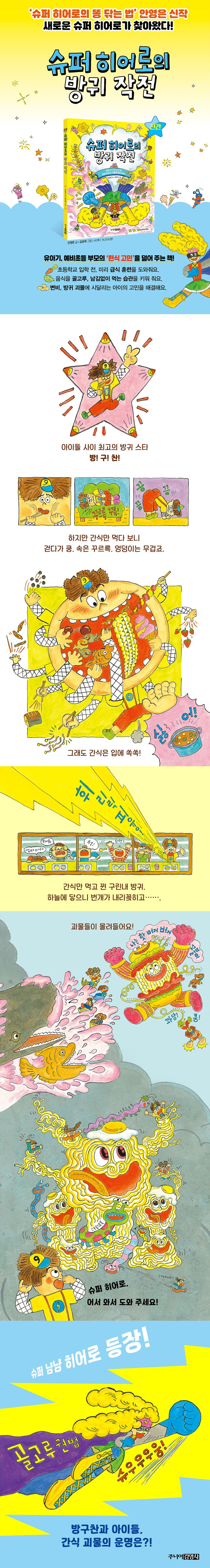 볼로냐 라가치상 수상 작가 안영은이 2025년 6월, 독자들의 마음을 두근거리게 할 새로운 슈퍼 히어로물로 돌아왔다. 한때 ‘어린이 방귀 스타’로 소문난 방구찬이 간식만 먹은 지 100일이나 되었다. 구찬의 구린내 폴폴 나는 방귀가 하늘에 닿자 휘리릭 피융! 번갯불이 식탁 위 간식들에 내리꽂히고, 매캐한 연기 사이로 괴물들이 몰려들기 시작한다. 절체절명의 순간 ‘슈퍼 냠냠 히어로’가 등장해 멋지게 아이들을 구해 내고, 그 모습을 방구찬은 황홀하게 바라본다. 이때 수트 사이로 눈에 익은 하얀 가운이 삐져나온 것을 본 구찬은 몹시 놀라고야 마는데······.