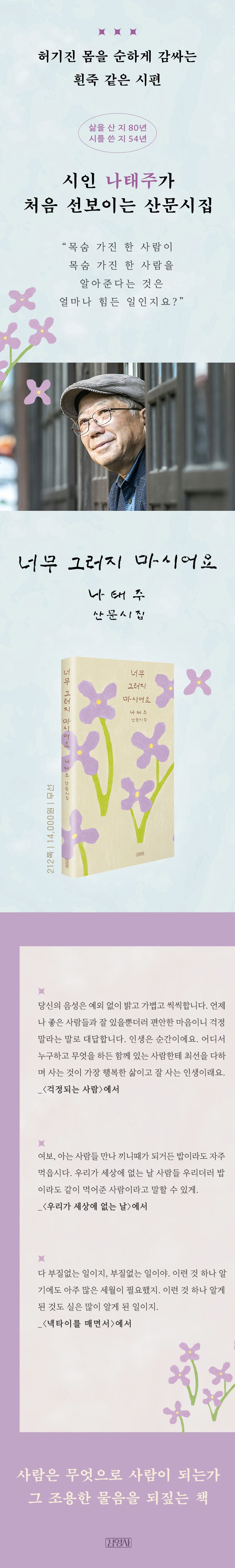 《너무 그러지 마시어요》에서 시인은 목숨이 간당간당한 것, 작고 낮은 풀꽃 같은 것, 흔들리는 자신과 생명에 시선을 두며 그 속에서 깨달음을 발견한다. 나는 왜 “한들한들” 살지 못했는지 물으며 “될수록 덜 후회하는 사람”이 되기 위해 노력하자고, “내가 살고 싶은 대로” 살아보자고, “이렇게 떨리지 않는 다리로 산을 오를 수 있다는” 오늘에 감사하자고 읊조린다.