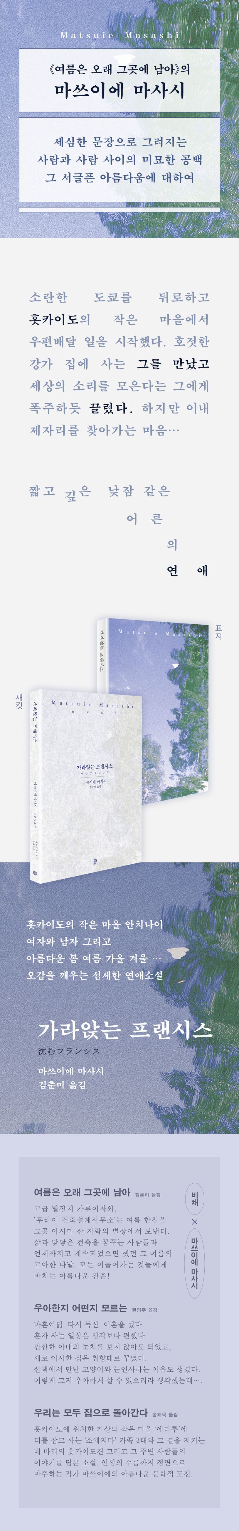 홋카이도의작은마을안치나이여자와남자그리고아름다운봄여름가을겨울…짧고깊은낮잠같은어른의연애강물에시체같은무언가가떠내려오는장면으로소설은막을연다.이런시작이라면경찰이나탐정이등장해목격자를수소문하고수수께끼를풀어갈법하지만《가라앉는프랜시스》는범죄수사물의길을단호히비껴가곧장장면을전환한다.우체국뒤주차장,주인공게이코가오늘배달할우편물을챙겨빨간배달차에오른다.도쿄의종합상사에서일하던그는몇달전모든것을정리하고홋카이도의작은마을로왔다.서른중반의여성이왜홀로시골에왔을까?어째서비정규직우편배달일에나섰을까?시골마을의시선이그에게쏠린것도무리는아니다.하지만낯설고불편했던시간은이내잦아들고,게이코는서서히마을에스며든다.그러던어느날,게이코는강가목조가옥에사는가즈히코를만난다.수수께끼의존재‘프랜시스’와함께산다는그는,세상의온갖소리를채집하는오디오마니아였다.주저하는게이코와달리가즈히코는거침없이다가왔고,두사람은연인이된다.사랑이시작되자게이코는그가점점더궁금해진다.알래스카의빙하가무너지는굉음,런던교외증기기관차의기적소리,남미축제의군중소리등그의컬렉션속에서세상의수많은소리가살아움직이지만,정작그의소리는듣지못한다.미묘한거리감과여전한비밀들.그리고어느밤,마을전체의불이꺼지고완벽한어둠이내려앉는다.자연과인간의숨결을담아낸섬세한감성과광휘한풍광으로빚어내는마쓰이에마사시의문학세계《가라앉는프랜시스》는삼십대의여자와남자가우연히만나설레고사랑하고고뇌하는풍경을담은연애소설이다.그풍경의구석구석마다공간에대한깊은이해,취향이있는풍요로운삶에대한동경,억겁의세월을견뎌낸자연에대한경외,켜켜이지혜를쌓아온어른을향한공경등《여름은오래그곳에남아》를잇는마쓰이에마사시의깊은재미와주제를담고있다.또한공간적배경으로는홋카이도의가상도시에다루를무대로한《우리는모두집으로돌아간다》와도맞닿아,작가의세계를연이어탐색하는팬이라면읽는재미가더확장될것이다.비채에서는성장소설《거품》,《여름은오래그곳에남아》의프리퀄작품인《천사도밟지못하는곳》가제등일본현대문단에서독보적인위치를점한마쓰이에문학을계속해서선보일예정이다.주요등장인물소개(※스포일러가포함되어있습니다)무요게이코:서른다섯살,남자와헤어지고십삼년간일한도쿄의종합상사를퇴사했다.홋카이도의작은산촌마을안치나이로터전을옮겨비정규직우편배달부로제2의삶을시작한다.데라토미노가즈히코:서른여덟살,강가단층집에서사는남자.오디오마니아.작은수력발전소를관리하며여유롭게산다.흰색지프체로키를탄다.와타나베기이치로:안치나이우체국국장.게이코가도쿄회사의몇분의일만큼의월급을받으며우편배달부일을지속할수없다고판단,게이코의결혼상대를찾아나선다.미노리카와:평소배달중간지점이되는사리베지구북동쪽끝에사는노부인.눈이보이지않아우편물낭독을부탁할겸게이코에게곁을내어준다.다치키:주유소직원이자동네소문의근원지.