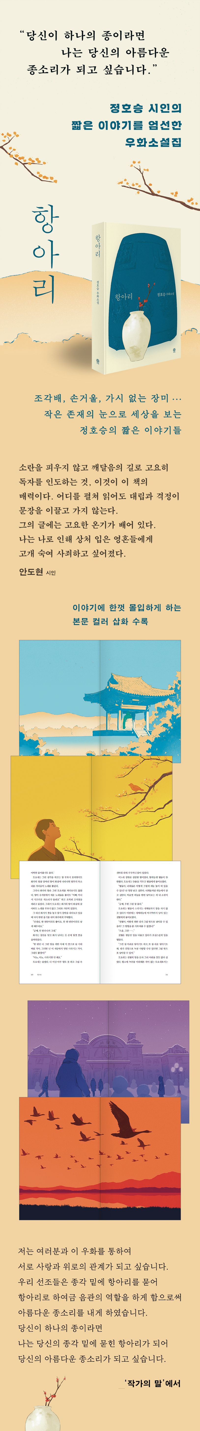 등단 50년이 넘는 동안 끝없이 새로운 세계를 구축해온 한국 서정시의 거장, 정호승. 그는 전 세대에게 사랑받는 시인일 뿐 아니라 소설과 동화로도 마음을 건네온 이야기꾼이기도 하다. 《항아리》는 정호승 시인이 쓴 단편 ‘우화소설’ 중 44편을 모아 엮은 단편집이다. 버려진 항아리, 바다로 가고 싶은 종이배, 누구도 자신을 봐주지 않아 슬픈 손거울 등 작고 사소한 것들의 눈으로 세상을 보는 짧은 이야기들이 담겼다. 수십 년간 스테디셀러로 사랑받아왔으며, 영어로도 번역 출간되어 세계 독자들에게 감동을 안겨준 이 작품이 현대의 감각으로 새롭게 태어났다. 동시대적 언어 감각으로 작품을 다듬었고 박선엽 일러스트레이터의 그림으로 표지와 본문 삽화를 전면 풀컬러로 새롭게 꾸며 이야기의 깊이와 감성을 더욱 풍성하게 전한다. 고급 양장 제본으로 완성하여 읽는 기쁨은 물론 책을 소장하고 간직하는 즐거움까지 더했다.
