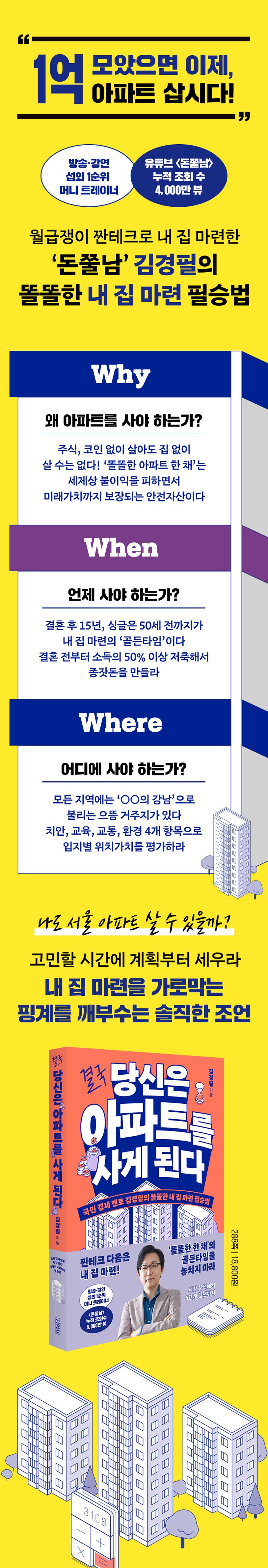 〈하이엔드소금쟁이〉〈구해줘홈즈〉등각종방송과유튜브에서재테크를하고자하는이들에게뼈때리는진단과실속있는해결방안을제시해온김경필,이제한걸음더나아가《결국당신은아파트를사게된다》에서는돈모으는사람이라면한번쯤은떠올려보았을내집마련의꿈을실현할수있는길을보여준다.