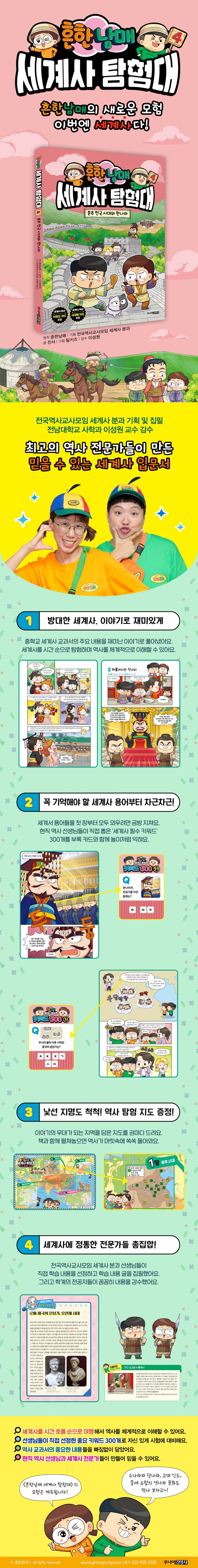《흔한남매 세계사 탐험대》 시리즈는 세계사를 처음 배우는 초등학생을 위한 세계사 입문 학습만화이다. 어린이들이 세계사의 흐름을 자연스럽게 이해할 수 있도록 시간순으로 세계사의 주요 사건들을 선별하고, 흔한남매의 흥미진진한 이야기와 엮어 기억에 오래 남도록 구성했다. 또 방대한 용어들 중에 먼저 알아야 할 키워드들을 제시하여 세계사 공부에 대한 부담을 줄였다. 현직 역사 선생님들이 직접 꼽은 ‘세계사 필수 키워드 300’ 카드를 제공해 아이들이 세계사 키워드를 놀이처럼 접할 수 있게 했고, 각 권에서 다루고 있는 지역을 상세히 담은 ‘세계사 탐험 지도’를 통해 공간 감각도 키울 수 있다. 최고의 역사 전문가들이 머리를 맞대고 만들어 더욱 믿을 수 있는 《흔한남매 세계사 탐험대》와 함께 이번에도 흥미진진한 세계사 모험을 떠나 보자!