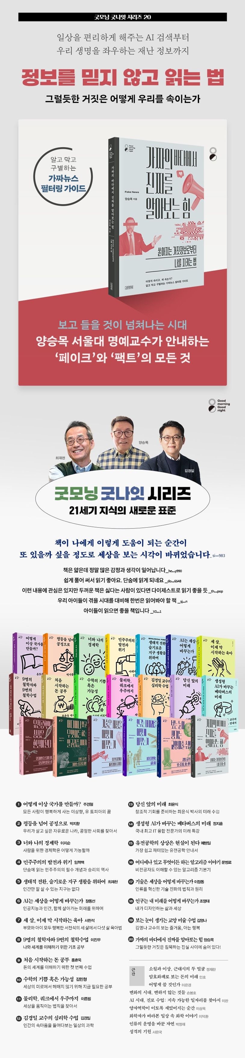 AI 검색이 일상화된 스마트폰 세계에서, 변동이 극심한 주식시장에서, 촌각을 다투는 재난 상황에서 가짜뉴스는 교묘히 우리 삶을 파고든다. 단순한 해프닝을 넘어 우리의 생명과 공동체의 미래를 좌우하게 된 가짜뉴스, 어떻게 대처해야 할까? SNS발 거짓정보에 한 번쯤 속아봤거나 인공지능이 알려주는 정보가 때때로 불안한 이들의 일상을 지켜줄 ‘팩트체크’와 ‘미디어 리터러시’ 길잡이.
