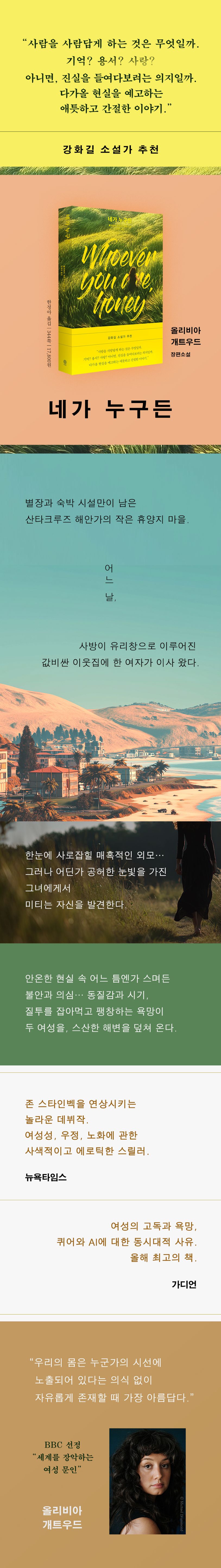 BBC ‘세계를 장악하는 여성 문인’으로 선정된 올리비아 개트우드의 첫 소설. 공연 예술 ‘스포큰 워드’ 형식으로 발표한 시 〈내 차가운 얼굴에 바치는 송가〉 등으로 유튜브 동영상 수백만 조회수를 기록하고, 두 권의 시집을 연이어 베스트셀러에 올린 그가 이번엔 소설을 통해 젊은 여성의 일상과 고난에 대해 논한다. 《네가 누구든》은 자신의 지난날을 은폐하고 어머니의 친구 집에 스스로를 가둔 미티와 남자친구에게 모든 것을 통제받는 이웃 레나, 두 여성의 만남을 그려내는 소설. “여성의 몸으로 산다는 것이 무엇을 의미하는지 스릴러의 문법을 차용하여 섬세하게 탐구한다”라며 찬사받았고, 출간과 동시에 웨스 앤더슨 제작사와 마고 로비 프로덕션의 참여로 영화화가 확정되었다.