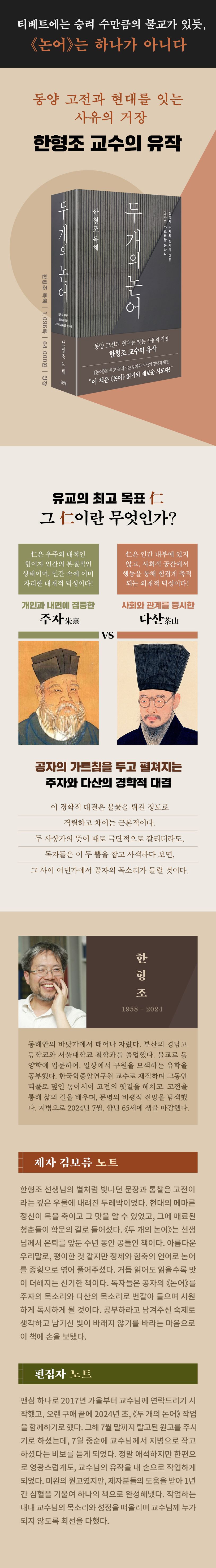 3년간의 치열하고 치밀한 연구 끝에 원고 집필을 거의 마무리할 무렵, 안타깝게도 작고한 한형조 교수(1958-2024)의 유작 《두 개의 논어》가 1년간의 편집 끝에 세상에 모습을 드러냈다.