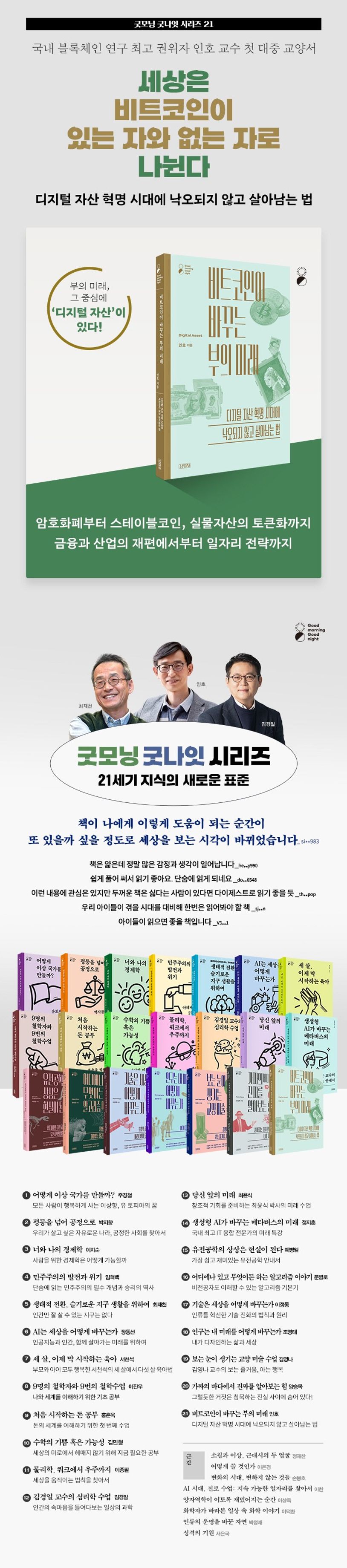 부자들은 더 부자가 되고, 가난한 사람은 더 가난해지는 시대다. 화폐 가치는 떨어지고 자산 가격은 끝없이 치솟는다. 우리는 어떻게 돈을 지키고 늘려갈 수 있을까? 《비트코인이 바꾸는 부의 미래》는 이 질문에 “디지털 자산 혁명 시대의 본질을 통찰하고, 그 변화에 직접 참여하라”고 답한다. 인호 교수는 지금을 ‘디지털 자산 혁명 시대’로 규정하며, 이 거대한 전환의 흐름을 이해하고 그 안에서 기회를 포착하는 것은 선택이 아니라 생존의 문제라고 강조한다. 비트코인에서 시작된 블록체인 혁명은 이제 실물자산 토큰화(RWA)로 확장되고 있다. 이 책은 블록체인의 원리와 비트코인의 가치, 글로벌 RWA 시장 흐름과 한국 산업의 새로운 기회를 한눈에 조망하며, 디지털 자산의 현재와 미래를 입체적으로 제시한다. 디지털 자산 혁명 시대에 낙오되지 않고 살아남기 위한 필독서다.