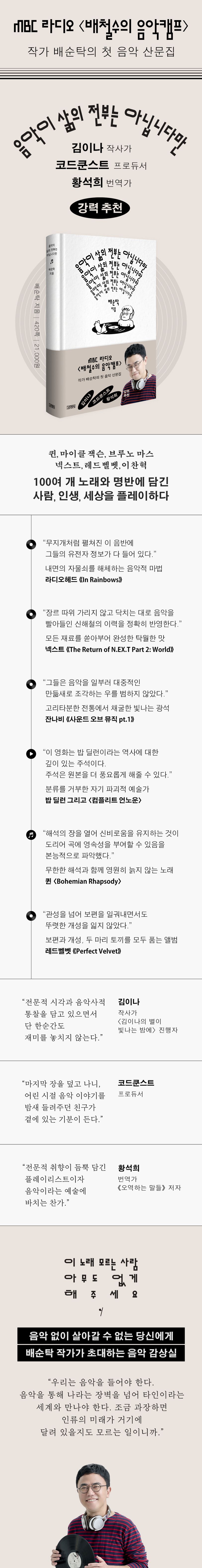 배순탁 작가는 100여 개의 명반과 노래를 통해 우리에게 ‘어떻게 살아야 하는가’를 묻는다. 음악을 통해 축적된 그의 경험은 단지 음악을 설명하는 데 그치지 않는다. 음악에 기대어 살아온 기록이 쌓이자, 그 플레이리스트는 어느새 한 사람의 인생 아카이브가 되었다. 《음악이 삶의 전부는 아닙니다만》을 읽다 보면, 당신도 깨닫게 될 것이다. 플레이리스트 속 이야기가 어느새 자신의 이야기가 되어 있는 순간을.