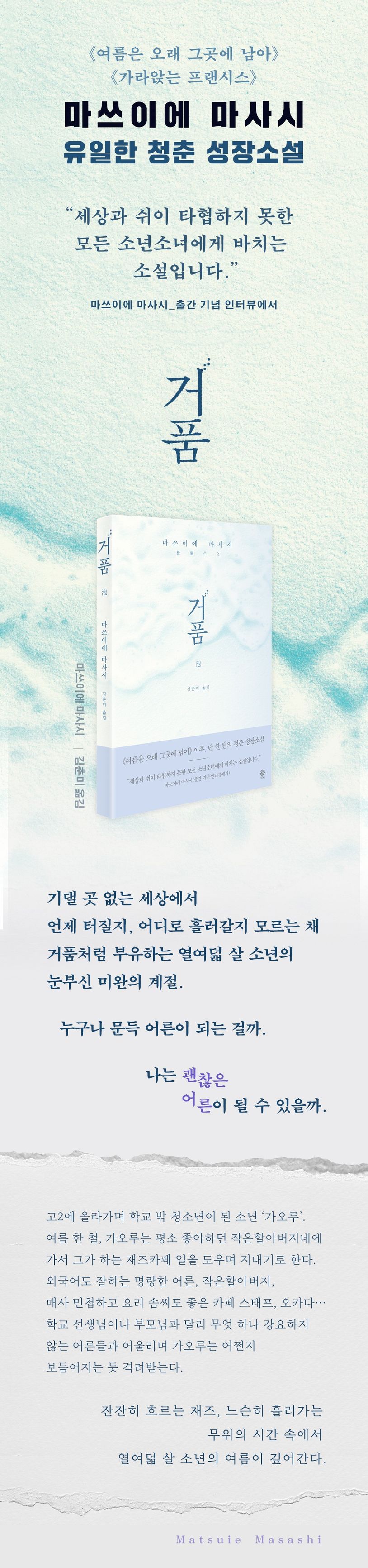 《여름은 오래 그곳에 남아》로 데뷔 이래, 고요하고 정밀한 필치로 풍요로운 세계를 선보여온 마쓰이에 마사시. 이번에는 청춘소설 《거품》으로 한국 독자를 찾는다. 《가라앉는 프랜시스》《우아한지 어떤지 모르는》 등 삶의 균열과 회복의 순간을 섬세하게 그려온 작가가 처음으로 열여덟 살의 소년을 주인공으로 내세운 작품이다.