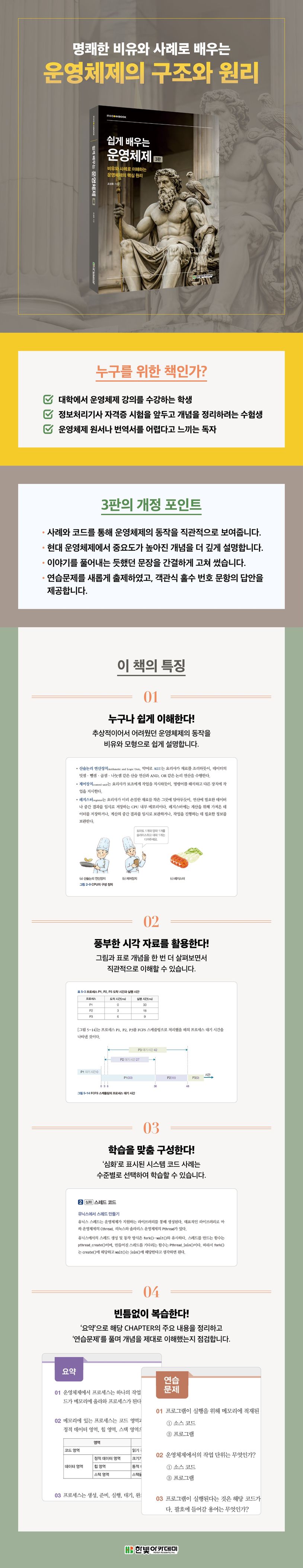 『쉽게배우는운영체제(3판)』은운영체제의기본구조와핵심원리를배우고자하는IT학과학생을대상으로합니다.주요개념은실생활의사례를통해설명하고,개념간의관계는그림과표로정리하였습니다.운영체제구성요소의유기적관계를파악할수있도록각파트도입부에개념지도를수록하였고,시스템코드사례를심화요소로구성하여구체적인동작원리를학습할수있도록하였습니다.※연습문제해답은객관식홀수번호문항에한해제공합니다.