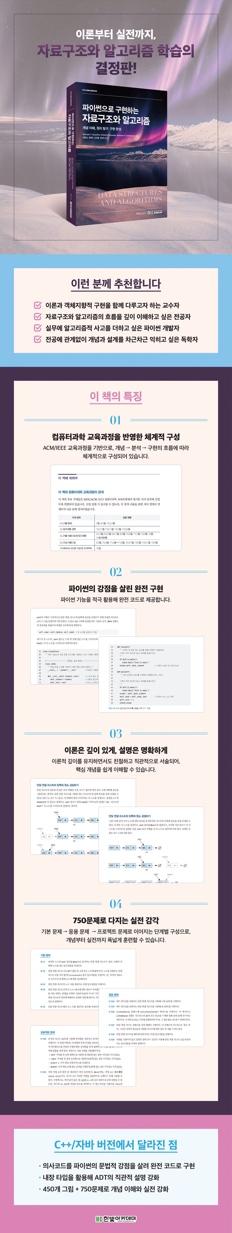 이 책은 기초 개념부터 알고리즘 최적화와 고급 응용까지, 핵심 내용을 폭넓고 깊이 있게 다룬다. 각 주제는 ‘개념 이해-원리 탐구-구현 완성’의 흐름에 따라 구성되며, 작동 원리를 직접 구현하고 성능을 분석하는 과정을 통해 사고력을 탄탄히 기를 수 있다. 처음 배우는 이에게는 균형 잡힌 입문서로, 중·고급 개발자에게는 깊이 있는 참고서로 활용될 수 있다.