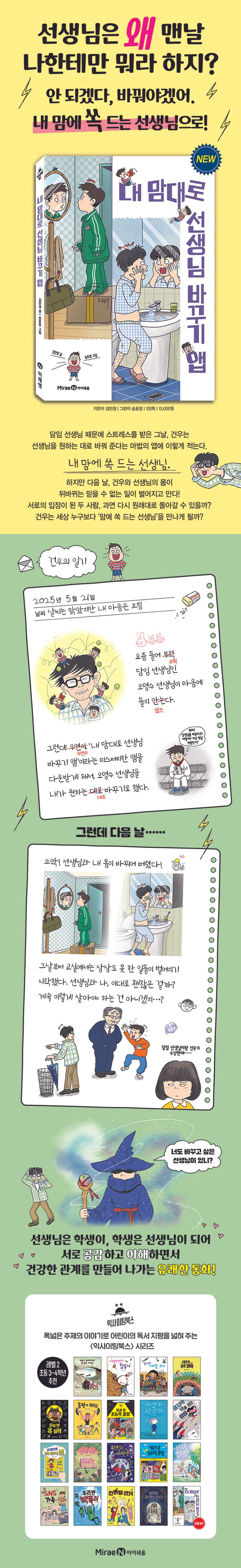 친구의 성격을 내가 원하는 대로 바꿀 수 있던 《내 맘대로 친구 바꾸기 앱》에 이어, 선생님의 성격을 내 맘대로 설정하는 특별한 ‘내 맘대로 선생님 바꾸기 앱’이 나타났습니다. 파란색 옷을 입은 마법사 캐릭터의 말을 따라 바꾸고 싶은 선생님의 모습과 내가 원하는 선생님의 모습을 적으면 신기한 앱의 힘으로 선생님의 성격이 달라지는 것입니다.