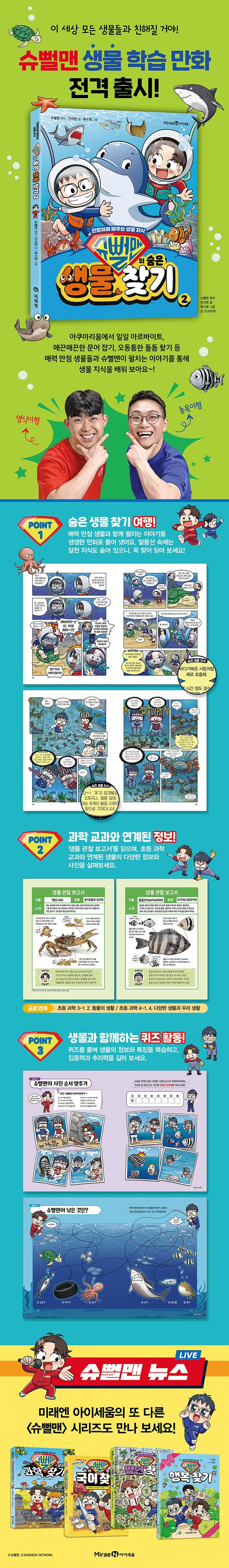 슈뻘맨과떠나는숨은생물찾기여행!아쿠아리움에서돌고래먹이주기,다친가오리치료하기,바다거북찾기,갯바위근처에서게탐구하기,위기에빠진복어도와주기등매력만점생물들과슈뻘맨이펼치는재미만점에피소드를생생한만화로풀어내었습니다.등장인물의말풍선속에는알찬생물지식도숨어있으니,꼭찾아읽어보세요.과학교과와연계된생물관찰보고서!'초등과학3-1.2.동물의생활','초등과학4-2.4.다양한생물과우리생활'등초등과학교과와연계된'생물관찰보고서'가수록되어있습니다.'돌고래','상어','바다거북','가오리','돌돔','복어'등생물의사진과함께다양한정보를배워보세요.생물과함께하는똑똑한퀴즈활동!본문중간중간에는다양한활동으로구성된다섯개의퀴즈가수록되어있습니다.퀴즈를풀며생물의정보와특징을다시한번복습하고,집중력과추리력을길러보세요.*인증유형:공급자적합성확인