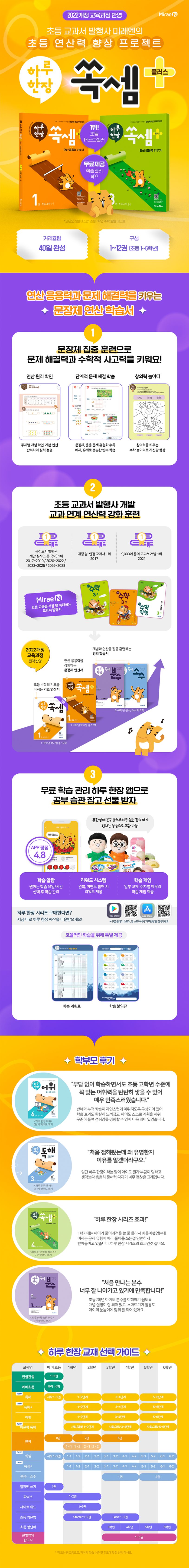 연산의 기본 원리를 이해하고 반복적으로 계산하는 훈련을 했다면, 이제 “하루 한장 쏙셈 플러스”로 실력을 키워 주세요. 문제 해결력을 키우고 상위권으로 도약할 수 있습니다.