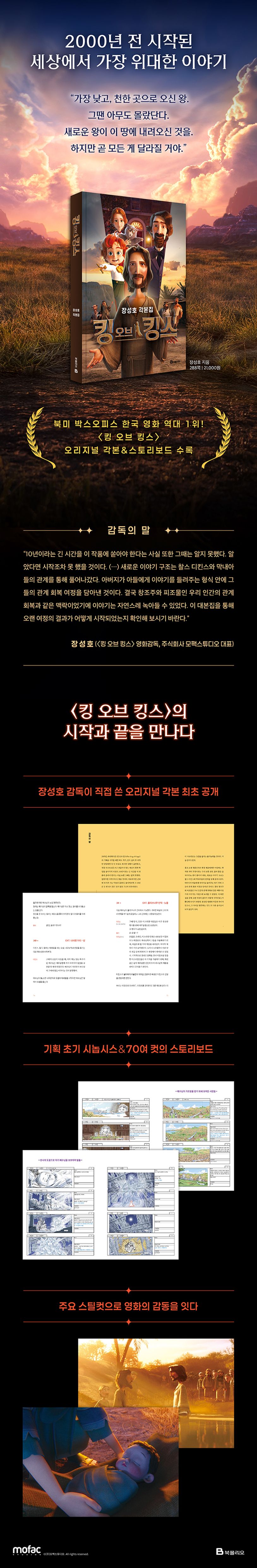 예수의 탄생부터 부활까지의 여정을 감동적인 서사와 더불어 사랑, 용서, 믿음, 희생의 메시지를 순수한 아이의 눈을 통해 풀어내는데…. 《킹 오브 킹스 각본집》은 이 영화가 만들어지기까지의 숨은 과정을 고스란히 보여준다. 장성호 감독이 직접 쓴 오리지널 각본과 70여 컷의 스토리보드는 영화의 재미와 감동을 더욱 폭넓게 느낄 수 있게 친절히 안내할 뿐만 아니라 영화와 다른 차이를 발견하는 뜻밖의 즐거움까지 선사한다. 쓰고 그리며 수없이 덧그려진 감독의 고뇌와 인내의 흔적, 비로소 영화 속에 피어난 환상적인 디테일과 진정성을 이 책을 통해 다시 한번 느껴보자.