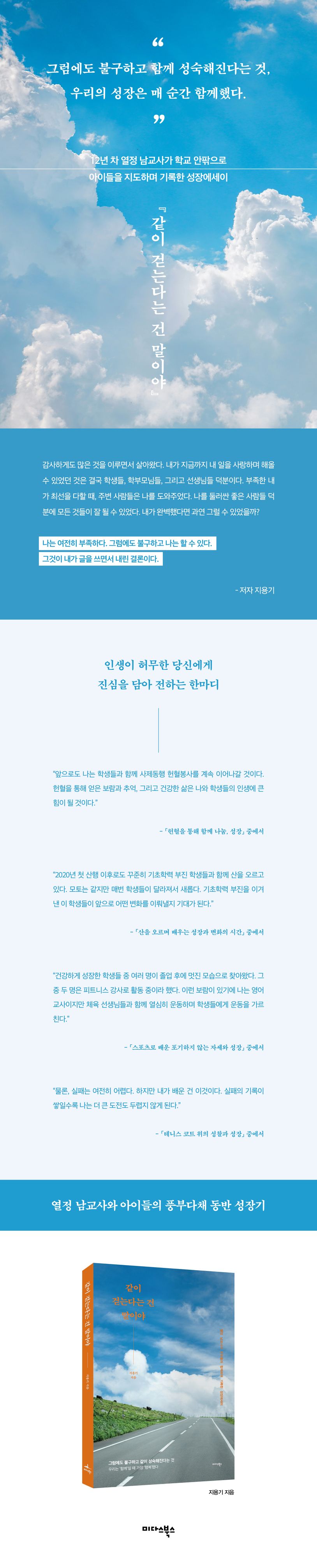 『같이 걷는다는 건 말이야』는 12년 차 고등학교 교사인 저자가 학생들과 헌혈, 등산, 자전거 라이딩 등을 함께하며 학생들의 성장을 이끌고 저자 또한 눈부신 성장한 경험을 기록한 성장 에세이다. 성장에 대한 고찰이나 교과서 같이 정답이 정해진 책이 아닌 저자가 직접 경험으로 건진 성장의 생생한 여정을 담았다.