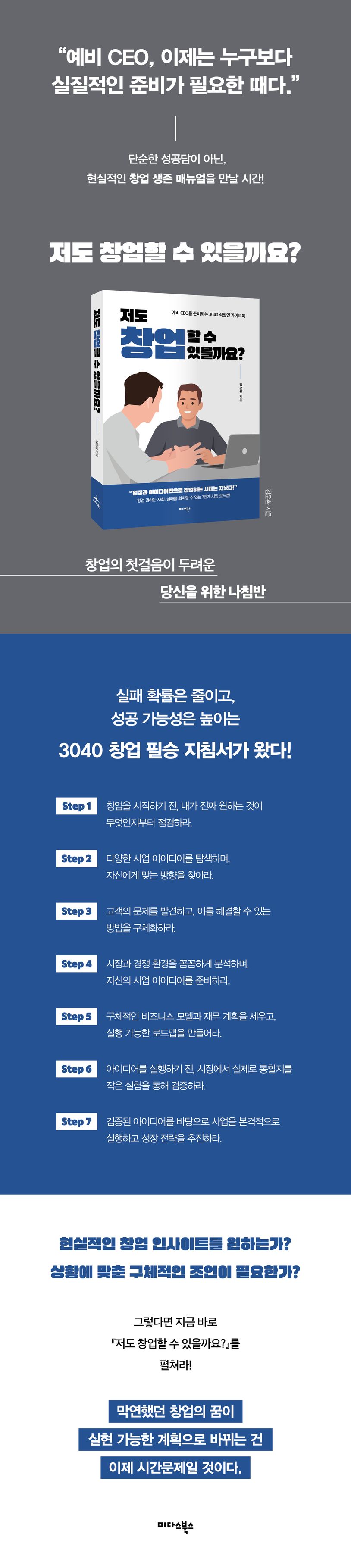 누구나 한 번쯤 창업을 꿈꿔보지만, 막상 도전하기란 쉽지 않다. 어떤 사업을 해야 하는지, 내가 정말 준비가 된 게 맞는지, 창업을 결심한 순간부터 수많은 질문과 고민이 밀려온다. 『저도 창업할 수 있을까요?』는 이러한 질문의 답을 찾기 위해 구체적인 과정을 제시하는 책이다. 창업을 준비하는 3040 직장인들의 현실적인 고민을 바탕으로, 창업을 구체적으로 계획하고 실천하는 방법을 안내한다.