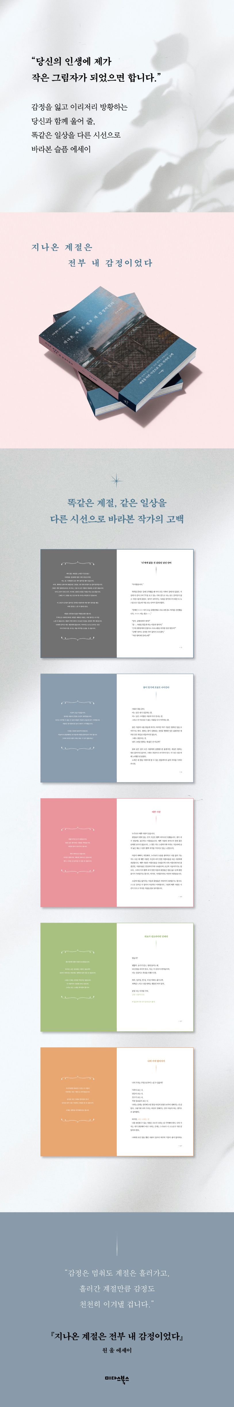 해가 지면 잊었던 그림자가 다시 나타나는 것처럼 『지나온 계절은 전부 내 감정이었다』는 여러분의 인생 속 어두운 시절 기억나는 글이 되어 줄 것이다. 힘들고 지칠 때면 가끔 찾아와 위로를 받아도 좋다. 이제 어두웠던 과거는 잊고 앞으로 펼쳐질 행복을 항해 나아갈 때이다. 이 책과 함께 그 찬란한 시작을 떠나보자.
