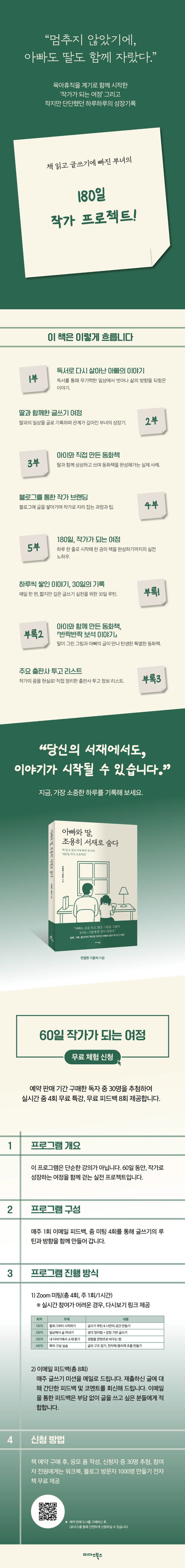 이 책은 단순한 글쓰기 에세이나 책 쓰기 가이드가 아니다. 아빠와 딸이라는 관계 속에서 함께 자라나는 감동적인 성장의 기록이다. 1부부터 5부까지 이어지는 이야기 속에는 다양한 울림이 담겨 있다. 자아를 회복한 아빠의 이야기, 육아휴직 후 딸과 함께한 소중한 일상들을 따라가다 보면 어느새 뭉클한 감동이 밀려온다. 특히 CHAT GPT를 활용한 동화책 만들기, 블로그 글쓰기 전략 등은 실용성까지 갖추고 있어 글쓰기, 책 쓰기에 관심 있는 독자에게 아주 쉽고 유용한 지침이 될 것이다.