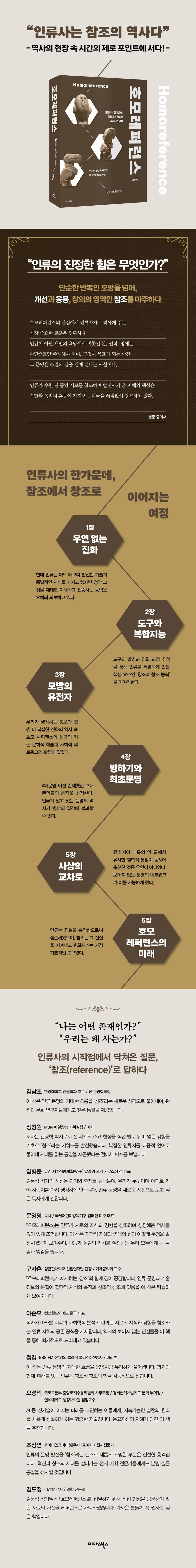 이 책은 인류는 모두 ‘호모레퍼런스’, 즉 참조하는 인간이라고 말한다. 인류의 시작과 진화, 그리고 문명의 발전을 ‘참조(reference)’라는 키워드로 해석했다. 인류사를 풀어낸 책은 많다. 그러나 이 책은 장대한 인류사에 더해, 명확한 키워드와 균형 있는 시선으로 근본적인 해답을 제시하여 색다르다. 인류의 힘은 특별히 뛰어난 개인에 있는 것이 아니라 집단적 지식의 축적과 참조에 있었다는 것이다.