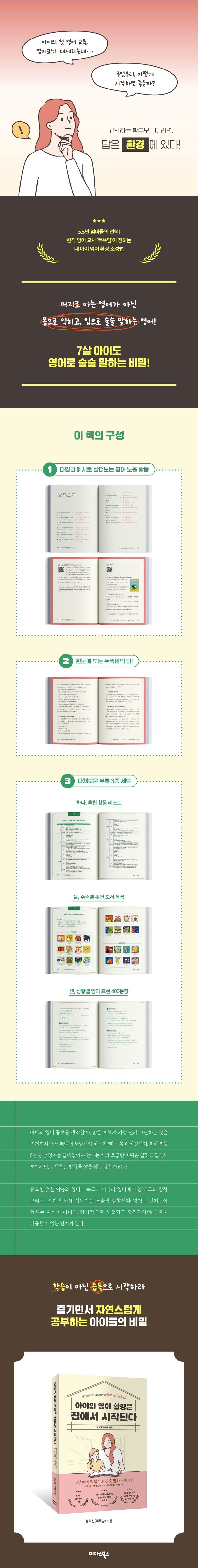이 책이 강조하는 핵심은 크게 ‘영어 환경’과 ‘영어 노출’이라는 두 가지 키워드에 있다. 아이의 귀를 열어주는 듣기 환경 조성법에서부터, 영어 그림책을 통한 감각 확장법, 입을 트이게 하는 발화 자극법 등 다양한 실천 및 놀이법들을 구체적으로 담았다. 여기에 아이들과 직접 활용해 볼 수 있는 다양한 부록을 통해 실용성을 더했다. 저자의 아이인 ‘쭈똑이’가 월령대별로 접해 온 콘텐츠와 활동을 소개하는 ‘노출 활동 정리표’에서부터, 수준에 맞게 참고해 볼 수 있는 ‘추천 그림책 예시’, 아이와 실제 생활 속에서 유용하게 활용해 볼 수 있는 ‘60가지 상황별 400여 개 문장 리스트’까지. 한 권으로 우리 집을 편안하고 효과적인 ‘영어 환경’으로 꾸려 내기에 제격이다.