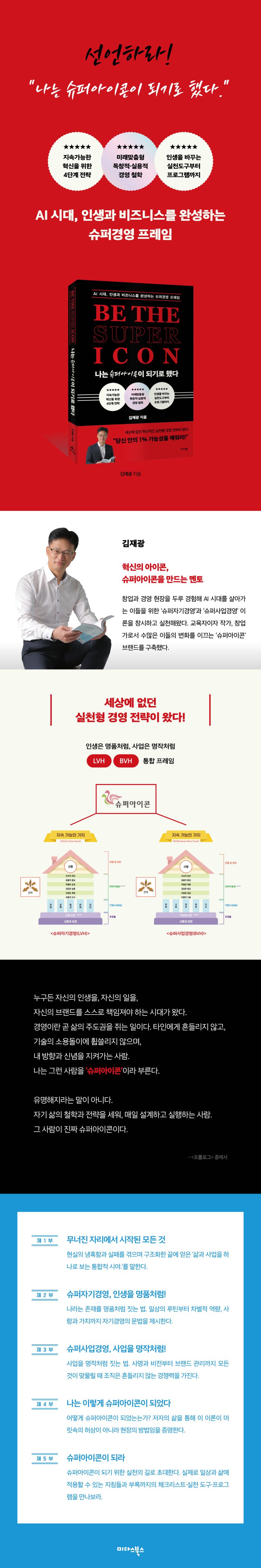 이 책은 AI 시대에 ‘인생과 비즈니스’ 경영을 하나의 설계도로 통합하는 ‘슈퍼자기경영(LVH)·슈퍼사업경영(BVH)’ 프레임을 제시하고, 실패와 도약의 실제 경험을 바탕으로 누구나 실행 가능한 방법으로 ‘슈퍼아이콘’으로 성장하도록 안내하는 실전형 경영 안내서이다.
