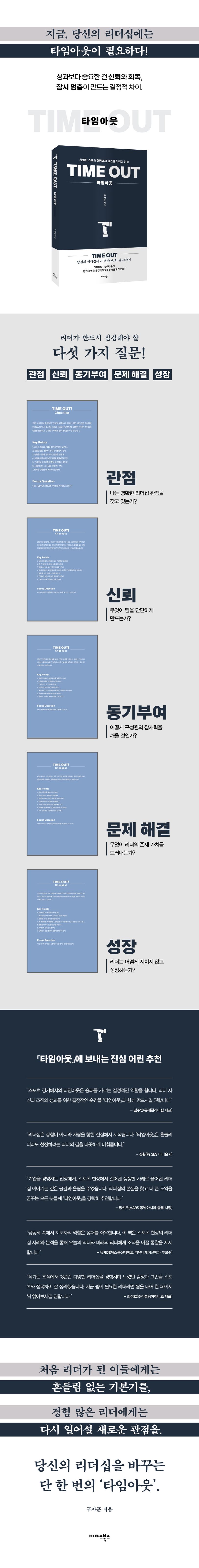 『타임아웃(TIME OUT)』은 스포츠 현장의 치열한 순간을 통해 조직 리더십의 본질을 되짚는 자기계발서다. 스포츠를 단순한 오락이나 승부가 아닌, 목표를 세우고 전략을 수립하며 팀워크를 발휘하는 전 과정을 응축한 무대로 바라본다. 경기 속 긴장과 승부, 승리와 패배가 남긴 교훈은 곧 조직 리더가 매일 마주하는 과제와도 맞닿아 있다.