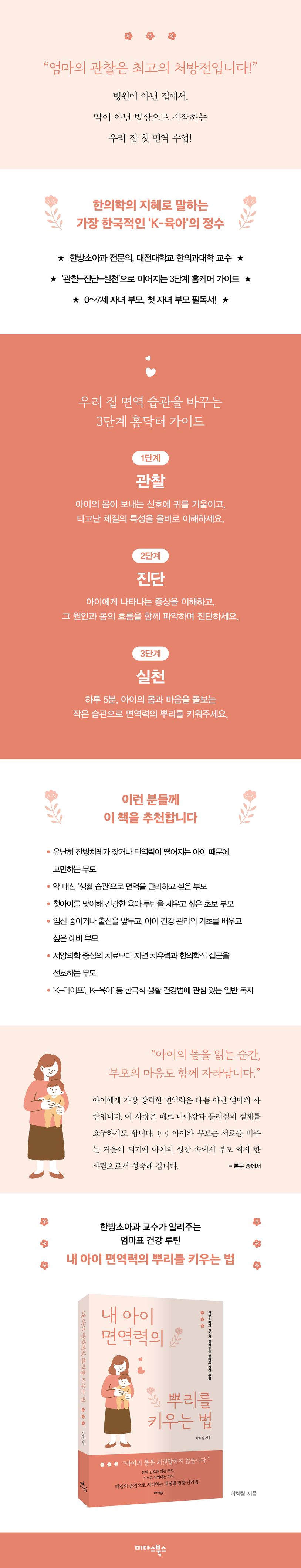 세계적으로 ‘K-컬처’ 열풍이 불고 있는 시점, 한국적인 라이프 스타일을 기반으로 한 ‘K-육아’에 대한 관심 역시 뜨겁다. 『내 아이 면역력의 뿌리를 키우는 법』은 한방소아과 전문의이자 두 아들을 키운 ‘교수 엄마’가 전하는 실전 가정 의학서다. 아이의 몸이 전하는 작은 신호를 바탕으로, 건강과 면역의 원리를 이해하는 한의학의 지혜를 쉽고 자세하게 풀어냈다.