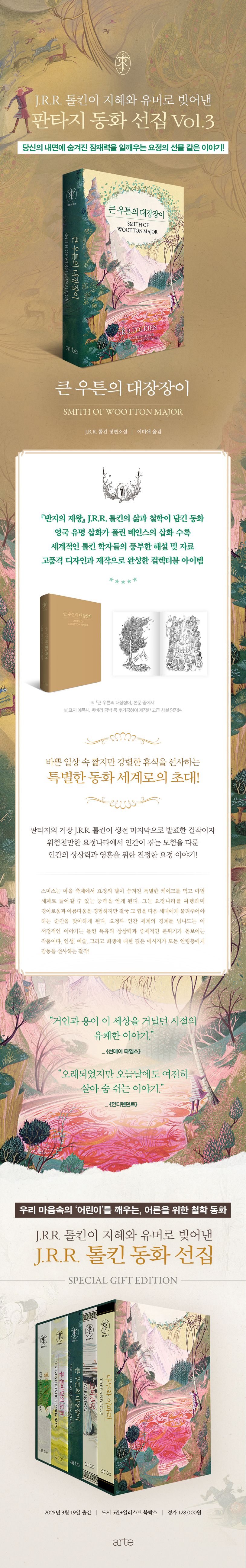 판타지 문학의 거장 J.R.R. 톨킨의 숨겨진 보석 같은 작품 『큰 우튼의 대장장이』가 〈J.R.R. 톨킨 동화 선집(전5권)〉의 세 번째 작품으로 출간된다. 〈J.R.R. 톨킨 동화 선집〉은 톨킨이 자녀들에게 들려주기 위해 지혜와 유머로 빚어낸 다섯 권의 귀중한 동화를 엄선한 것으로, J.R.R. 톨킨의 초기 작품부터 마지막 작품까지 아우르고 있어 톨킨의 창작 세계를 더욱 깊이 이해할 수 있는 중요한 문학적 자산이자 이정표 같은 작품집이다. 그중 『큰 우튼의 대장장이』는 J.R.R. 톨킨이 72세이던 1964년 집필을 시작해 75세가 되던 1967년 생전 마지막으로 발표한 작품이다. 그의 대표작 『반지의 제왕』이 출간된 지 10년이 지난 시점으로, 평생에 걸쳐 작업했던 실마릴리온 신화가 마무리되어가던 시기였다.