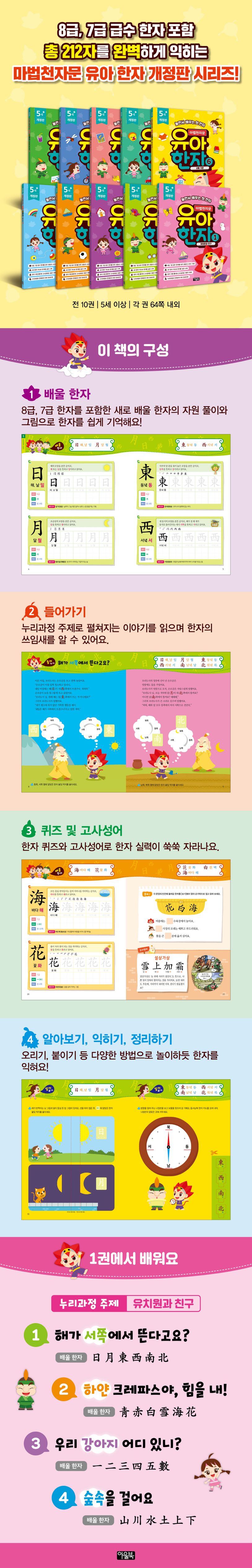 〈마법천자문 유아 한자〉 개정판이 출간되었습니다. 개정판에는 8급, 7급 급수 한자를 더 추가하여 8급 50자, 7급 100자를 포함한 총 212자의 한자를 배울 수 있습니다.