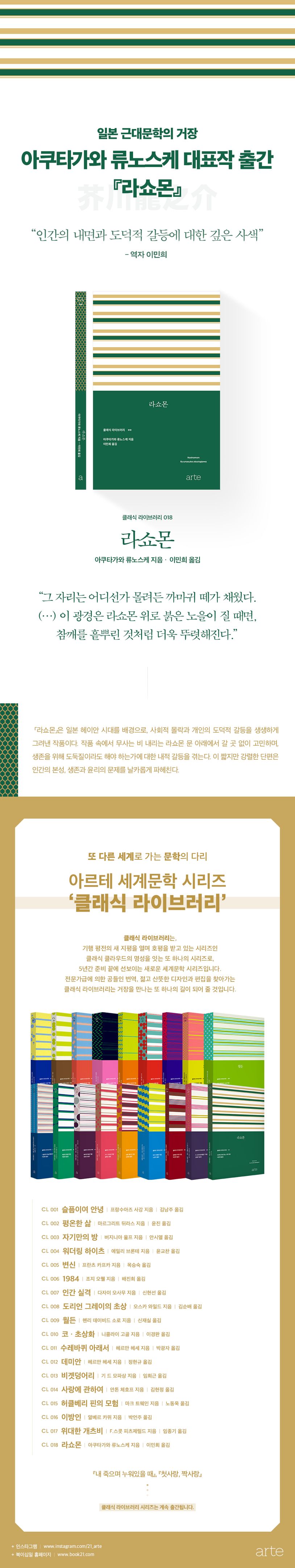 일본 문학사에 한 획을 그은 거장 아쿠타가와 류노스케의 대표작 「라쇼몬」이 현대적인 감각을 살린 한국어 번역으로 새롭게 출간되었다. 이번 번역본은 원문의 섬세한 뉘앙스를 충실히 살리면서도 현대 독자들에게 친숙한 문체로 다듬어져, 독자들에게 깊은 몰입감을 선사할 것이다.