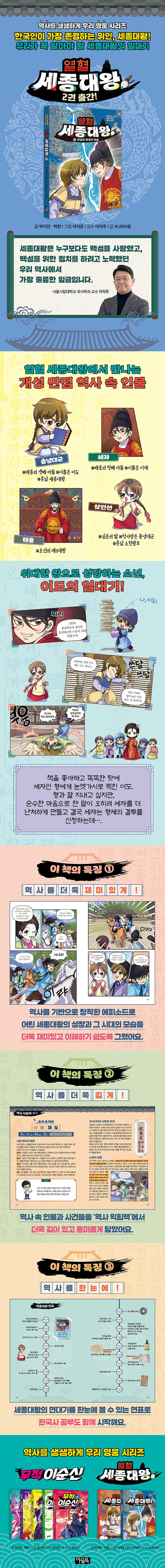 〈열혈 세종대왕〉은 세종대왕의 어린 시절 이야기를 역사에 근거한 가상의 에피소드를 섞어 만화로 그렸어요. 역사를 어렵고 지루한 옛날이야기로만 여기는 어린이들의 호기심을 자극하며, 자연스럽게 다음 이야기와 역사적인 사실들에 대해 궁금하게 만들어요.